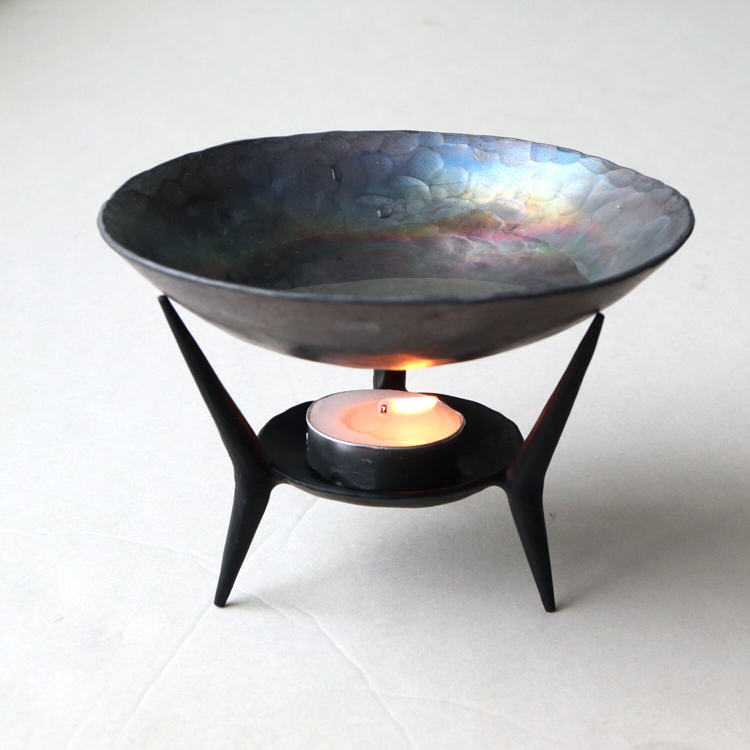 純チタンのお皿に水を注いでアロマオイルを数滴、ティーライトキャンドルを灯してしばらく待つと湯気が出始め香りが広がります。